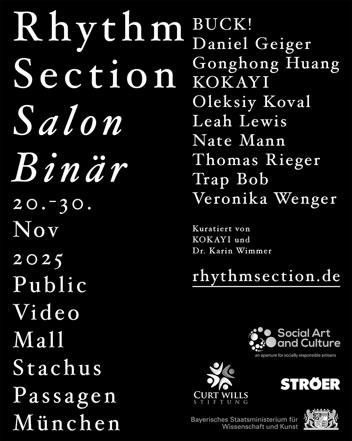 RHYTHM SECTION SALON BINÄR ist eine digitale Galerie im öffentlichen Raum, die Künstlerinnen und Künstlern die Möglichkeit gibt, sichtbar zu werden, und Passantinnen und Passanten dazu einlädt, an der Entwicklung digitaler Kunst teilzunehmen. Kunst öffnet sich dem Publikum – auch jenem, das nicht den Weg in Museen findet.